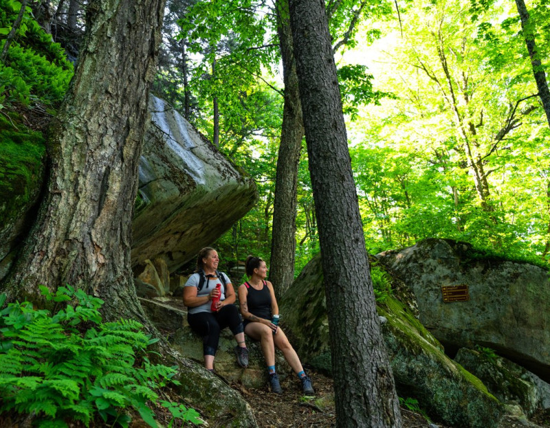 Point culminant des monts Sutton et du Parc d’environnement naturel de Sutton, le Round Top est accessible à tous, ce qui en fait l’un des sommets les plus populaires et fréquentés des Cantons, surtout à l’automne. À l’exception de la dernière section, plus escarpée et caractérisée par une volée de marches abruptes, c’est une montée modérée qui vous attend. Le sentier est parfait pour ceux qui souhaitent faire une randonnée en famille avec les enfants. Pendant votre ascension, faites un léger détour par le lac Spruce, une petite étendue d’eau en altitude nichée entre les montagnes. Cet automne, la station de Sutton mise sur le transport durable. Elle a lancé un groupe Facebook pour le covoiturage, ajouté un lien vers AmigoExpress sur son site, réservé quatre places de stationnement et organisé un tirage de passes annuelles pour les covoitureurs de l’Action de grâce!