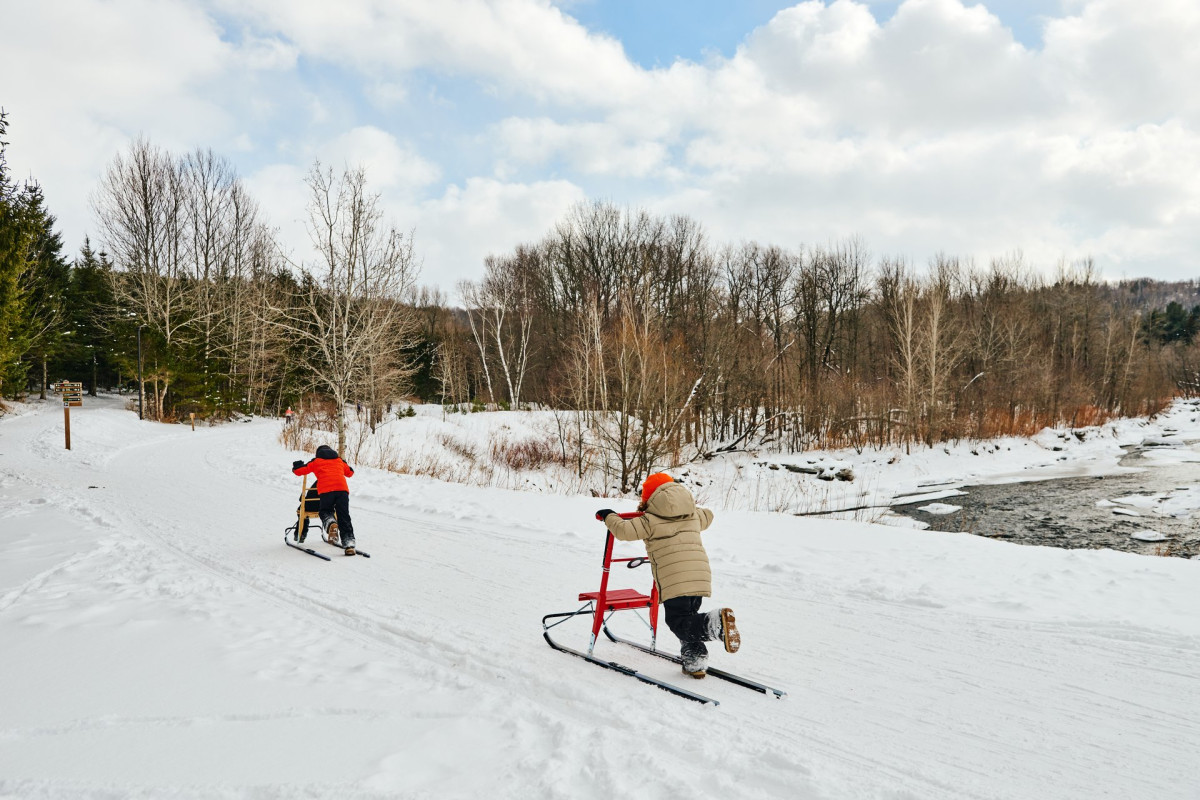 Avec la trottinette des neiges, il vous suffit de donner quelques bonnes poussées de jambe pour vous laisser filer sur la neige ou sur la glace. Vous pourrez faire la location de ces trottinettes au Parc de la Gorge de Coaticook et parcourir les sentiers prévus à cet effet! Et si vous souhaitez partager le plaisir avec votre compagnon à quatre pattes, c’est possible! Pour seulement 5 $ de plus, louez un équipement canin sur place et laissez votre chien vous tracter à travers les paysages enneigés. Pour en savoir plus, lisez le blogue de Laetitia Clouzot, qui a testé l’expérience!