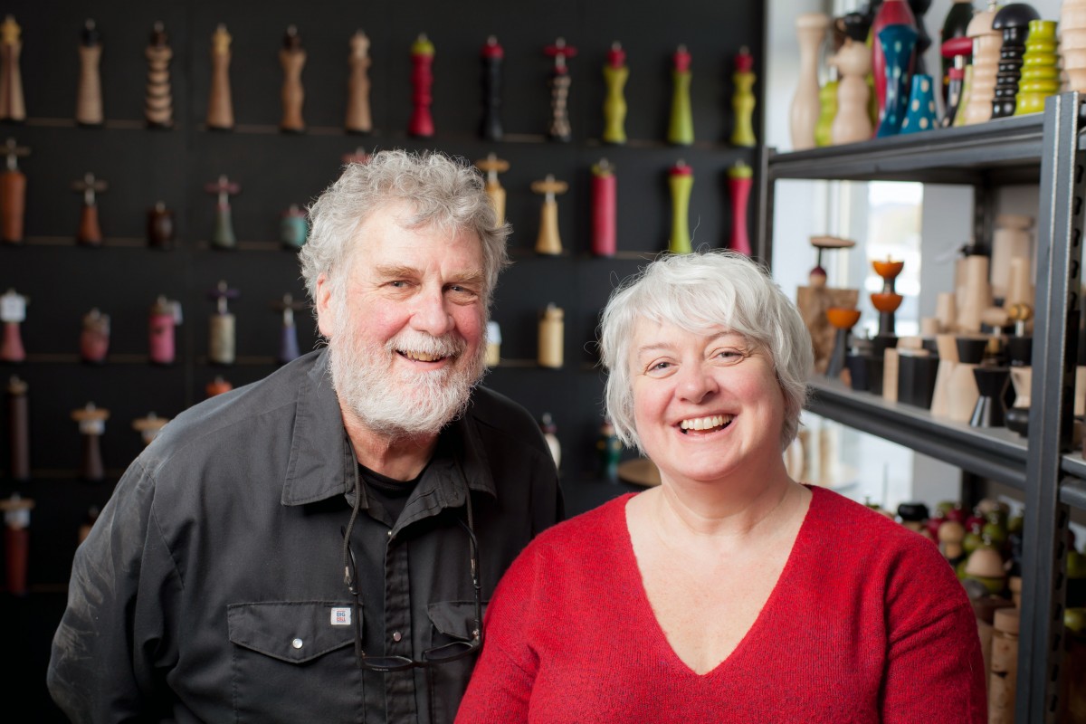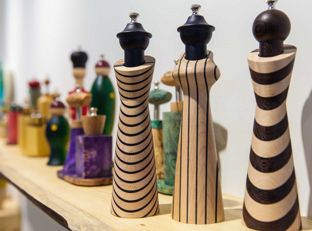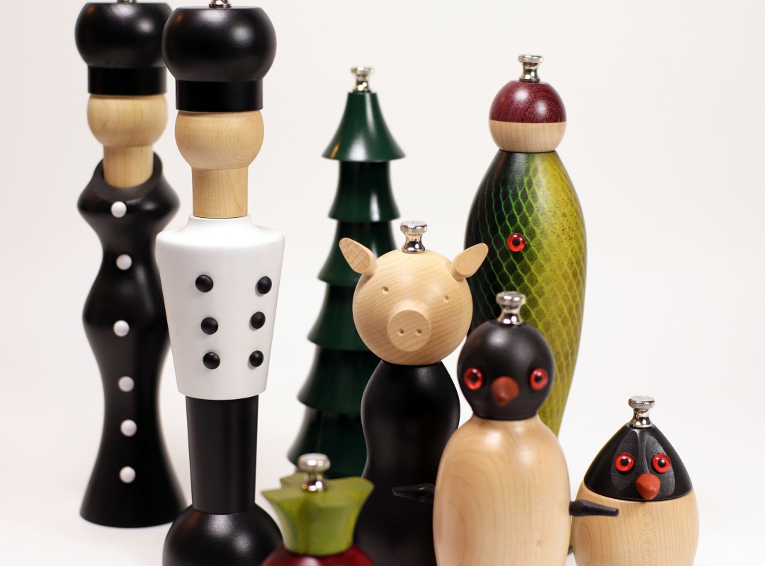 Dans cet espace, où l'âme de Sylvain continue de vivre, ils poursuivent ses collections, comme Banquet, avec des modèles évoquant des vêtements chics ou Épicurien, aux formes ludiques et pleines d’humour - chats, poissons, tomates, pingouins… Chaque pièce est unique et fabriquée à partir de différentes essences de bois dont l’amarante, le wenge, le pau amarello, le padouk, le noyer et l’érable de la région, en tête de liste. Elles sont offertes dans toute une palette de couleurs et dotées d’un mécanisme de grande qualité - le même que celui des moulins destinés aux professionnels de la cuisine – et garanties à vie.