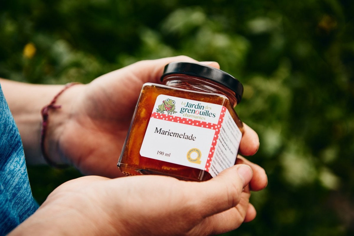 Un morceau de fromage Alfred de la Fromagerie La Station, avec la Mariemelade du Jardin des Grenouilles Charmantes.