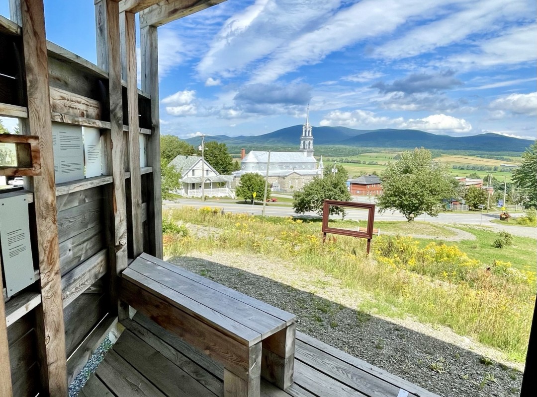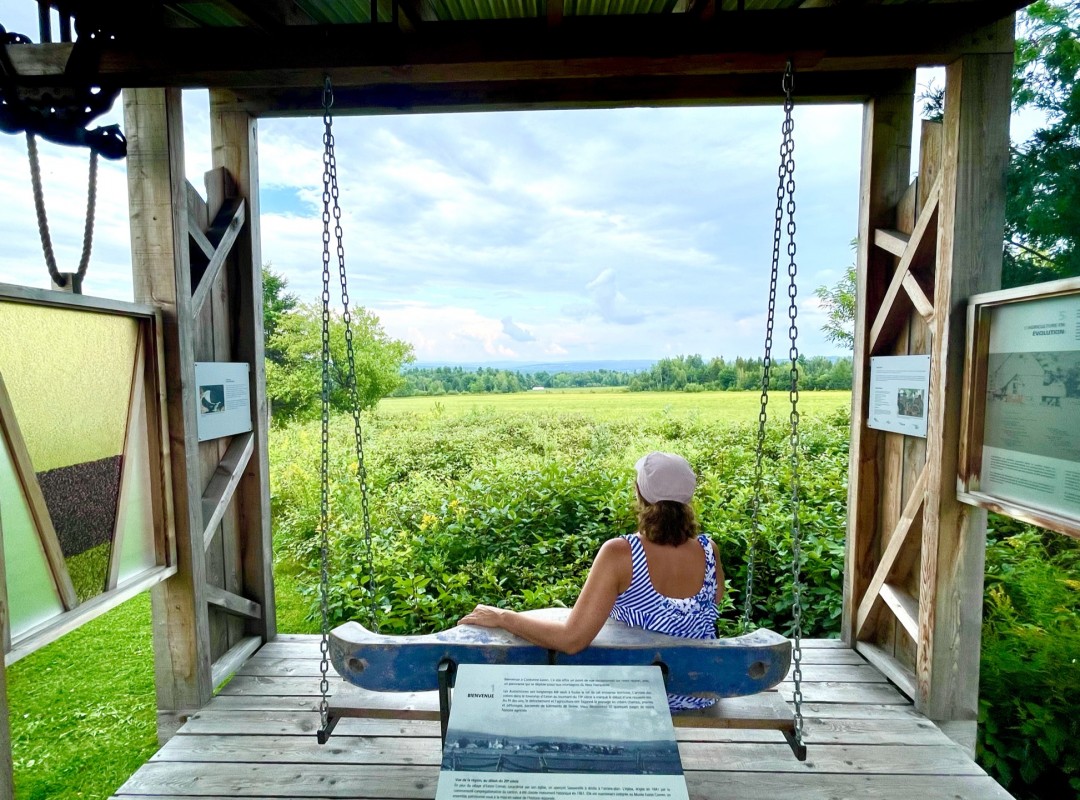 On poursuit notre virée jusqu’à Cookshire Eaton et faisons halte à sa shed ou encore une fois on jouit d’un panorama époustouflant. Depuis la balançoire, on contemple un horizon infini sur des terres agricoles et au loin les montagnes du New Hampshire.