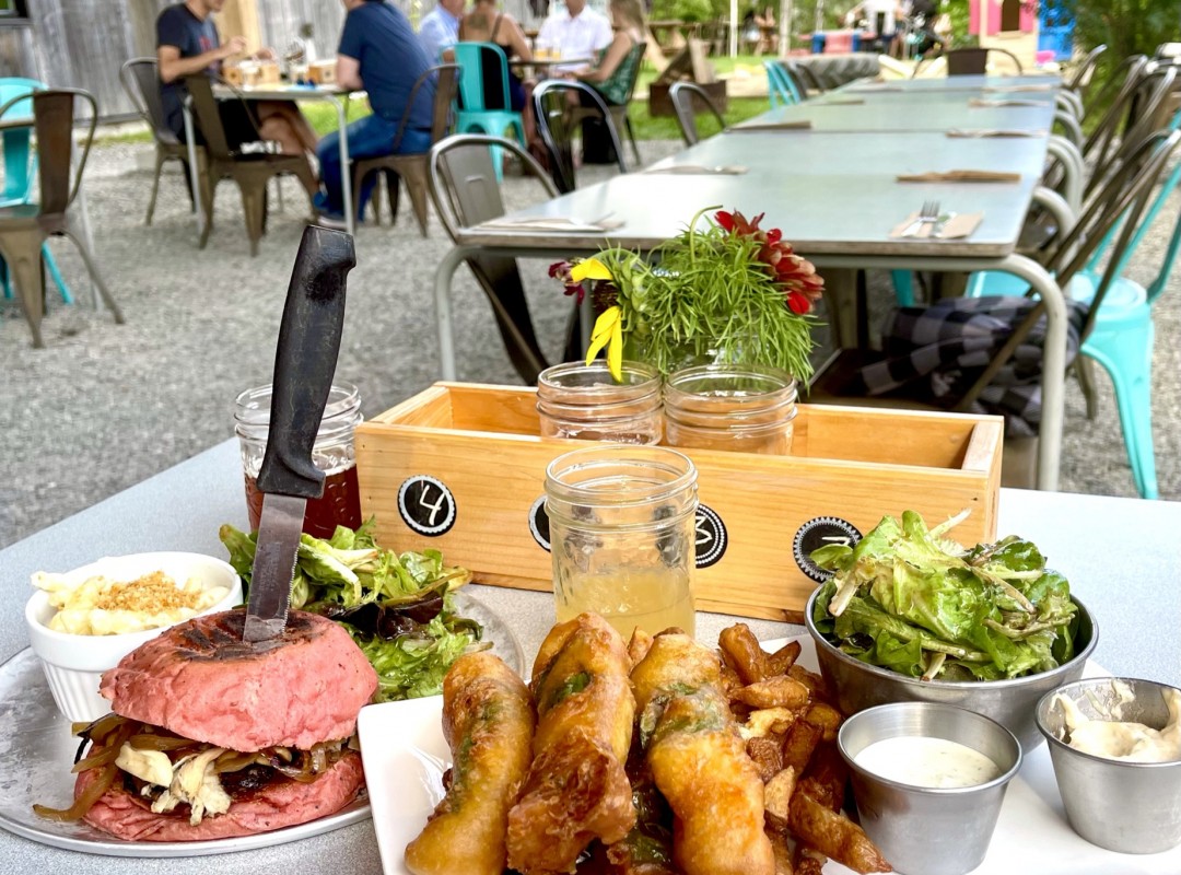 Après cette journée bien remplie, on se dépose sur la terrasse de la Microbrasserie 11 Comtés et son restaurant le Cuisinier déchaîné. Produits de la région et légumes bios de la ferme de Yannick Côté, propriétaire du resto, composent un menu qui émoustille les papilles ! Nous commençons par une palette dégustation de 4 bières, des créations fruitées fabriquées à partir d’ingrédients locaux. Puis, en entrée: bretzels à la bière et pakoras aux légumes, et en plats: fish and chips de truite et burger de cerf au pain rose (une touche de betteraves). On s’est régalés. Et nous n’étions pas les seuls! « Depuis l’ouverture, la croissance est fulgurante» m’expliquait la dynamique Julie Myre-Bisaillon, copropriétaire du resto, professeur, chroniqueuse et autrice. Elle raconte d’ailleurs des bribes de son quotidien (de fou!) dans cette microbrasserie avec beaucoup d’humour dans son roman «Des bières et des femmes ».