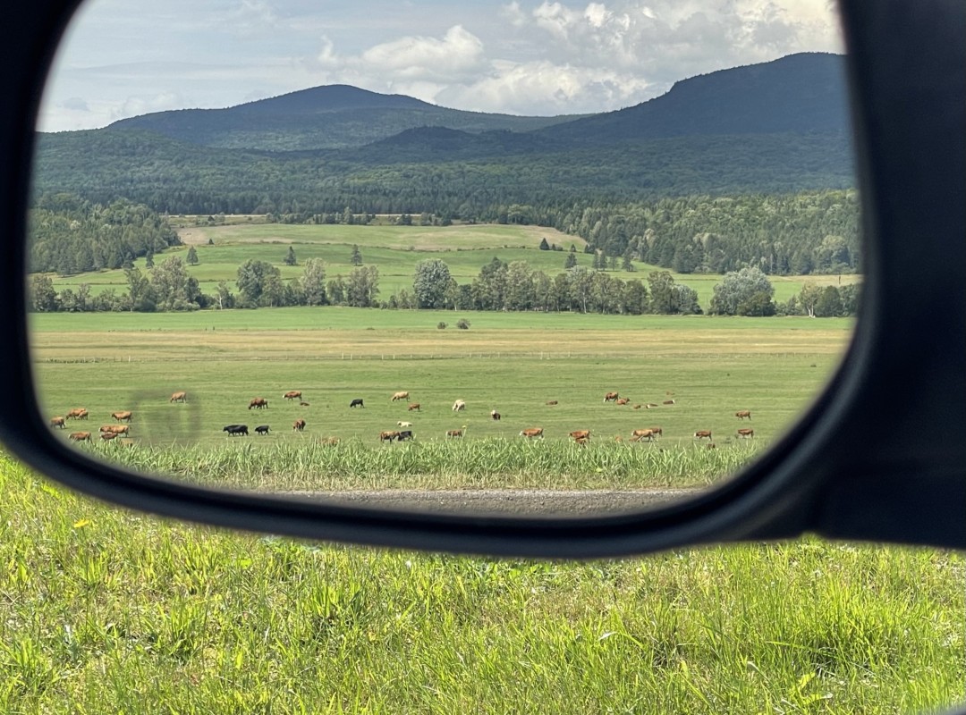 Cette partie de la route sur la 257 Nord offre des paysages superbes et typiques du Haut-Saint-François, une région composée de terres agricoles et forestières et sur cette portion, des sapins à profusion (s’y trouve une quarantaine de producteurs d’arbres de Noël). Dans le rétroviseur : une enfilade de sapins et de fermes, de plaines et de troupeaux de bouvillons qui paissent tranquillement avec en toile de fond l’omniprésent et majestueux mont Mégantic. La shed de La Patrie capture avec beauté ce panorama. La poétesse Éva Senécal, native de La Patrie, y exprime d’ailleurs par ses écrits ce que ce paysage lui a inspiré. On en profite de jour comme de soir car ce village perché fait partie de La réserve internationale de ciel étoilé. On y apprend aussi qu’il doit son nom aux nombreux Canadiens français revenus de la Nouvelle-Angleterre en 1875 et qui y ont élu domicile.