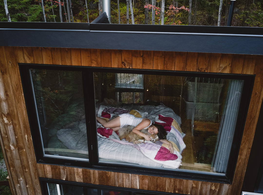 Les superbes cabines construites sur des pilotis et dont chaque terrain est déboisé seulement pour les y accueillir préservent la magnifique nature environnante. Ici, les besoins de commodités sont comblés, mais sans excès. Less is more, comme le dit le fameux adage. Les neuf cabines offrent toutes un exceptionnel point de vue sur la nature grâce à leur généreuse fenestration qui invite à la contemplation et au ressourcement. Les lits de qualité supérieure invitent quant à eux à rêvasser en admirant les montagnes, le lac ou la forêt selon la cabine choisie. Et pas besoin de vous casser la tête, car vous y trouverez tout pour cuisiner, manger et dormir.