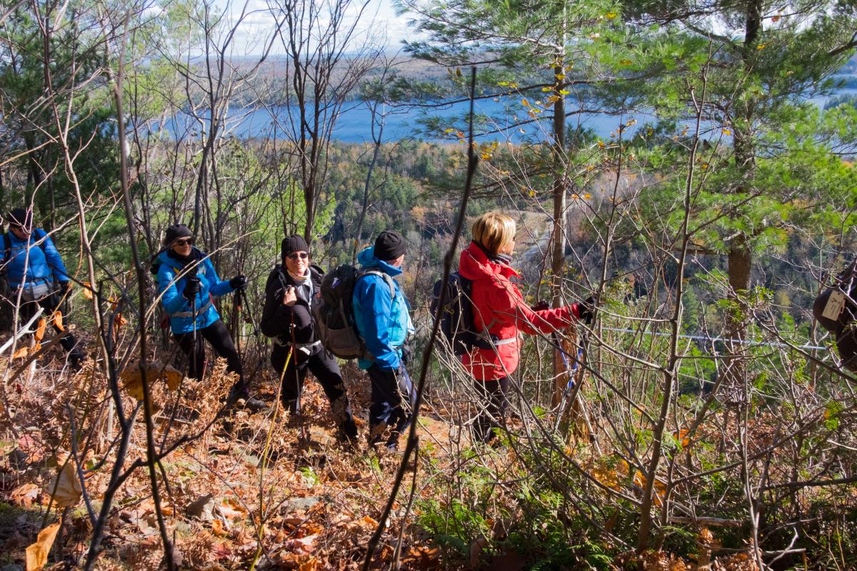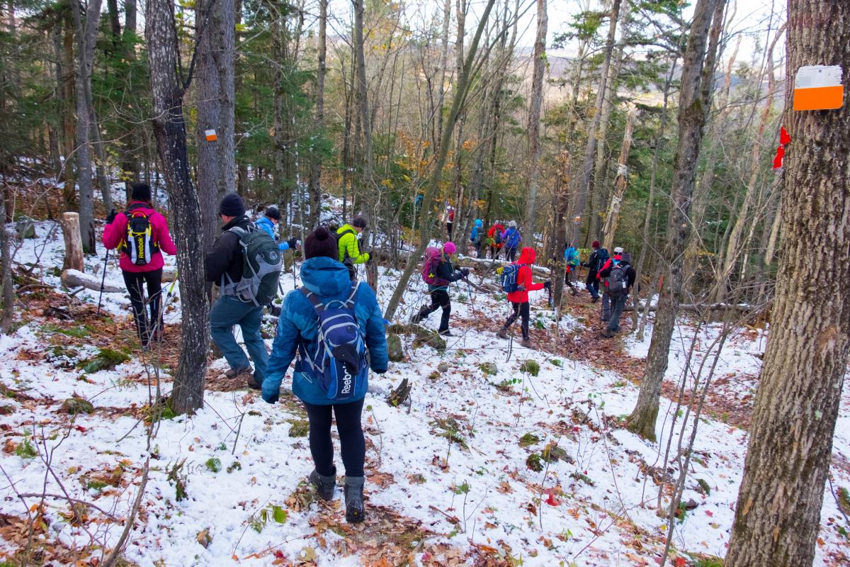 En sortant de ma voiture, je m’attends à un accueil timide – « C’est qui ce retardataire de Montréal? »-, voire glacial puisque je les ai fait patienter au froid. Or, c’est tout le contraire. En quelques minutes à peine, ces joyeux randonneurs m’intègrent à leur groupe, à coups de sourires francs et de blagues. Résultat : dès que notre cortège, composé en ce jour de semaine presque exclusivement de retraités à la forme resplendissante, se met en branle, je me sens déjà comme un membre de la confrérie. Notre itinéraire en ce vendredi frisquet? Fouler le mont Cathédral, une petite butte qui culmine à 403 mètres d’altitude, à travers un sentier de calibre intermédiaire de 10 km recouvert de feuilles colorées. Une sortie de 4 heures, incluant une pause repas.