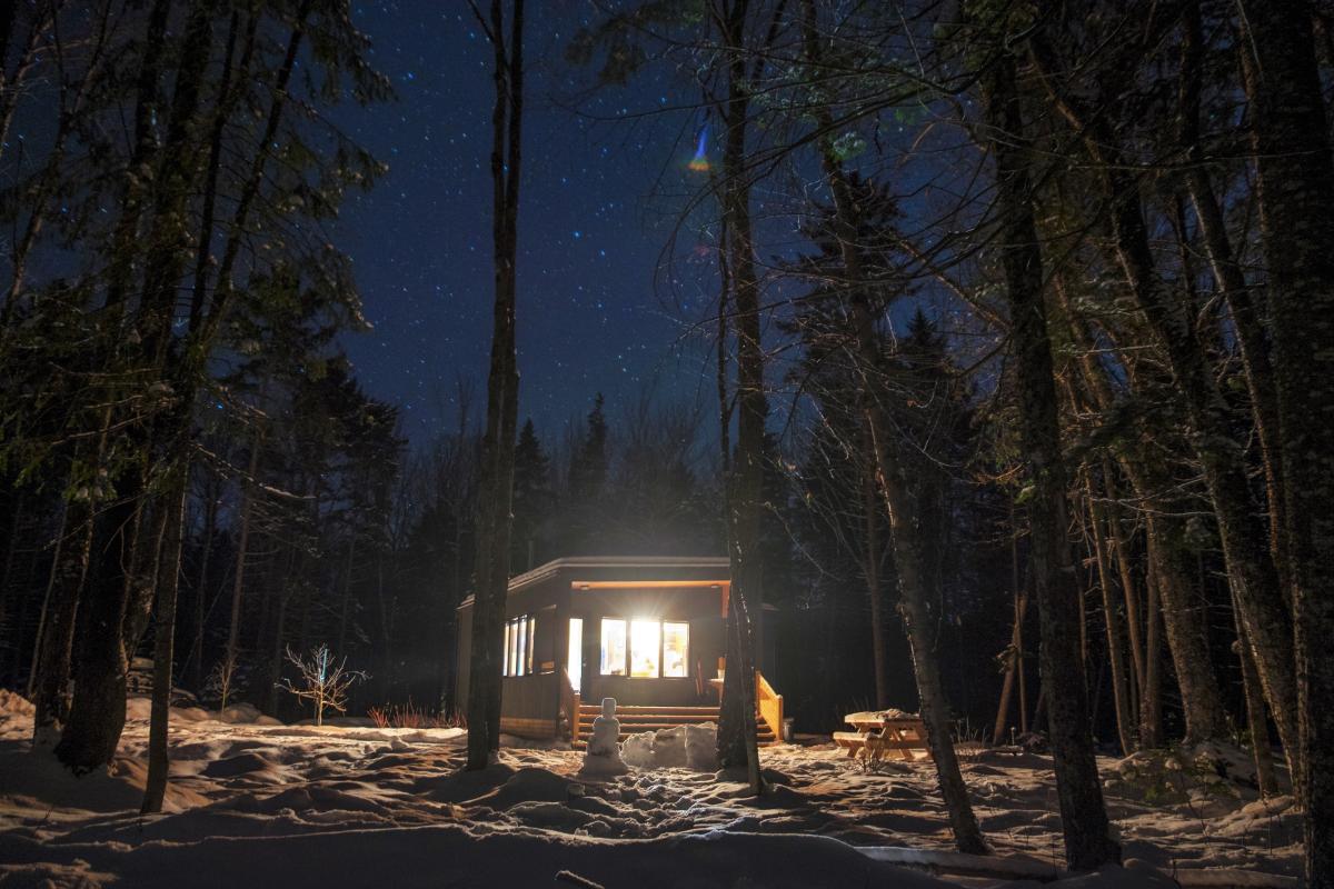 Notre camp de base pour deux jours, c’était le chalet Terre. Le défi sera de s’en extirper! À l’intérieur, un décor digne d’un magazine : murs et plafonds en revêtement de contreplaqué russe, fenestration généreuse abolissant la frontière entre l’intérieur et la nature environnante, mobilier sur mesure super fonctionnel, deux sofas moelleux et un foyer alimenté de bûches écologiques. Le confort de la ville en pleine nature. Nos voisins : des dindons sauvages et des cerfs de Virginie. La sainte paix.