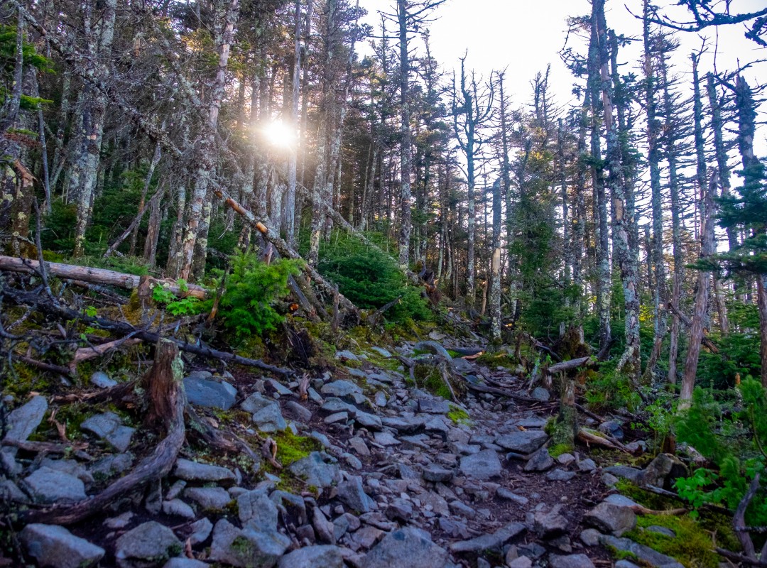 Après une nuit de sommeil au refuge Le Castor, j’arrive au stationnement jouxtant le pavillon Rose-Délima, exactement au lever du soleil, à 4 h 58. Le défi commence dans un sentier assez large et rocailleux. Les ruisseaux gorgés d’eau par les averses de la veille émettent un bruit de tonnerre. Cette bande sonore nettoie mes oreilles de la cacophonie urbaine. En grimpant, une brume épaisse envahit la forêt et filtre les rayons du soleil. Je me pince tellement c’est beau. Je ne regrette pas une seconde d’avoir grugé dans mes heures de sommeil.