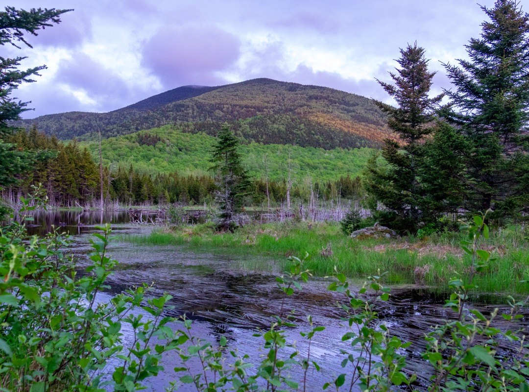 À 7 h 30, je foule finalement le point culminant des Cantons-de-l’Est où se dresse une tour exposée aux quatre vents. J’embrasse du regard toute la région. Au nord se trouvent le mont Mégantic et le lac du même nom. Au sud, les montagnes du New Hampshire et du Maine. La merveille derrière la cravate, je mets le cap sur le Cap-Frontière. Pour y accéder, je dois redescendre dans la vallée du ruisseau Clearwater en passant par le Petit-Gosford, puis remonter vers la frontière, qui suit la ligne de partage des eaux.