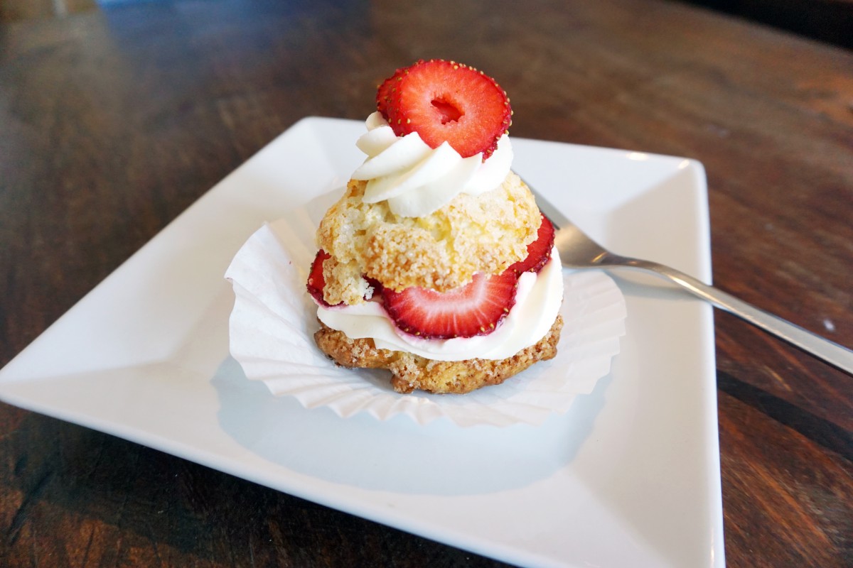 Il était le dernier dans le présentoir et il semblait crier mon nom. Son allure m’a intriguée dès le premier regard. On reconnait le shortcake par son allure, mais celui-ci n’était pas comme les autres. Ce gâteau était fait à partir de deux scones recouverts d’une riche crème à saveur de chocolat blanc, fromage à la crème et crème chantilly. Le goût était onctueux et goûteux. Un coup de cœur instantané.