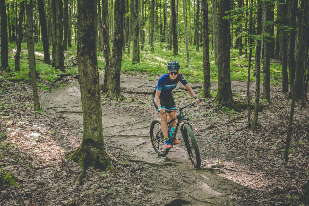 Après environ une heure d’éducatif, nous nous sommes dirigés vers les pistes débutantes derrière le CNCB pour nous familiariser avec les différents obstacles : racines, roches, boue. Tant d’éléments que je ne suis pas habituée de côtoyer lorsque je suis à vélo! Lorsque Nicolas nous a jugés prêts, nous nous sommes rendus au Mont Oak (dans le parc des Sommets de Bromont), à quelques kilomètres de là. Nous avons alors pu mettre en pratique ses enseignements. Les belles montées ont bien entamé les jambes; ce n’est pas évident lorsqu’on est habitués de rouler avec un vélo de 14 livres! De quoi digérer mon décadent gâteau fauxmage/lavande!