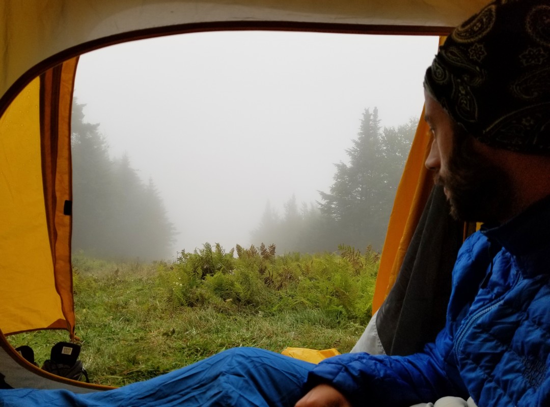 Vers 16 h, la pluie s’installe. Nous nous replions à l’intérieur de notre tente. Heureusement, nous avons apporté de la lecture. La pluie qui crépite sur la toile de la tente nous fait une apaisante musique de fond. Confinés à l’intérieur, nous soupons tôt en observant l’averse qui s’abat sur nous et sur le décor montagneux.