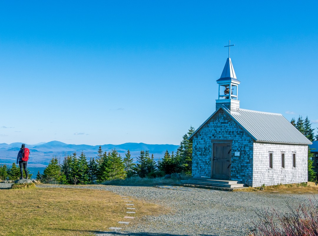 At the top of Mont Saint-Joseph, we needed to rest a bit. At an altitude of 1065 m., we found a wooden chapel which has been defying the summit’s strong winds since 1883. We were about a hundred metres from our eagle’s nest. We arrived just in time to view the first part of the solar performance: The last rays of the setting sun covered the Appalachian Mountains with its delicate pastel hues.