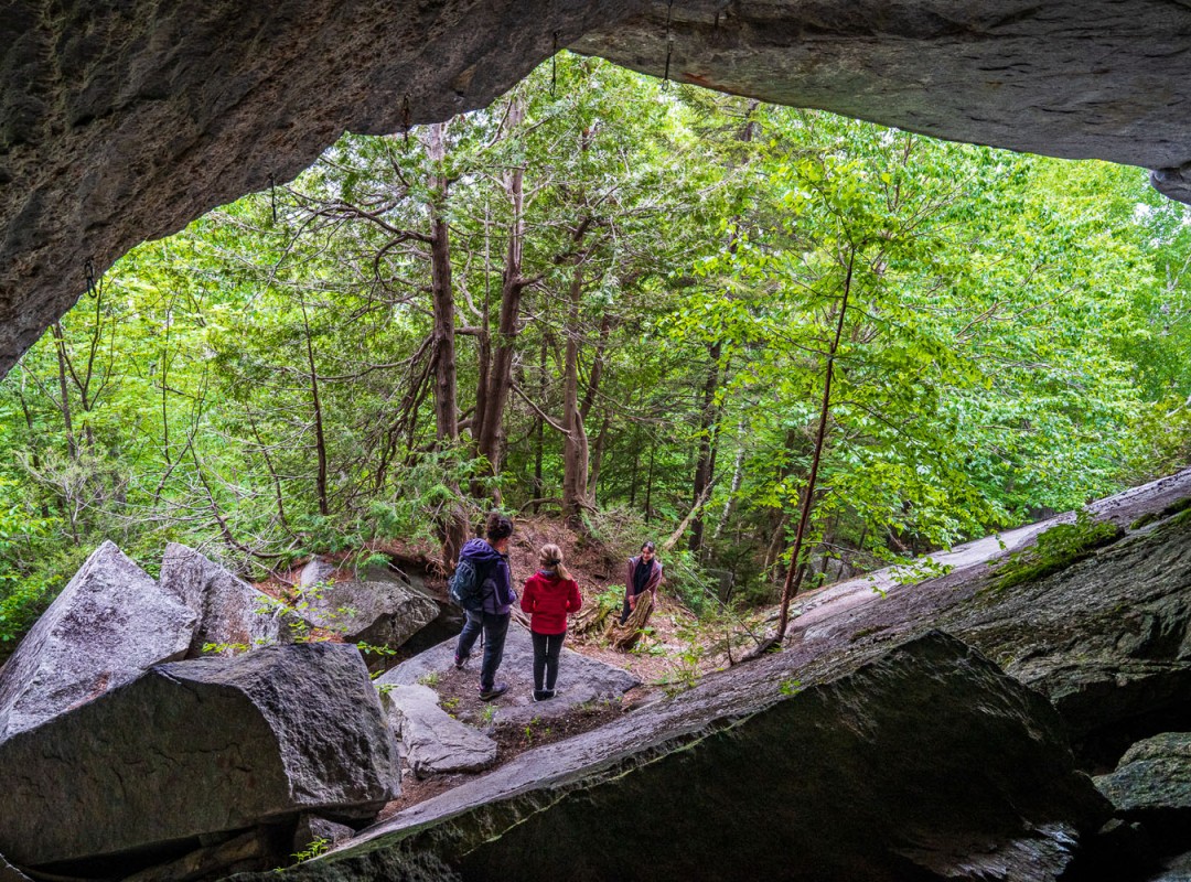 On accède au Pinacle à travers les sentiers du parc Harold F. Baldwin, qui partent du stationnement de l’église. En prenant le chemin le plus court, on arrive au sommet en près d’une heure, mais nous choisissons plutôt de sortir des chemins battus pour nous promener au pied des escarpements, en empruntant la piste des grimpeurs qui affrontent les parois de roc.