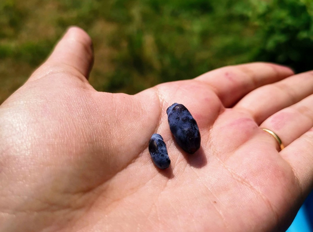 Honeyberries look a lot like blueberries, but have an oblong shape. These small, blueish oval berries with a plum-coloured flesh have a very unique and complex taste. Some varieties will have a rather sour flavour while others are sweet. What do they taste like? For my part, I picked two different varieties and I found they taste like a cross between a blueberry and a blackberry; others might notice hints of raspberry and black currant, or even plum and rhubarb flavours.