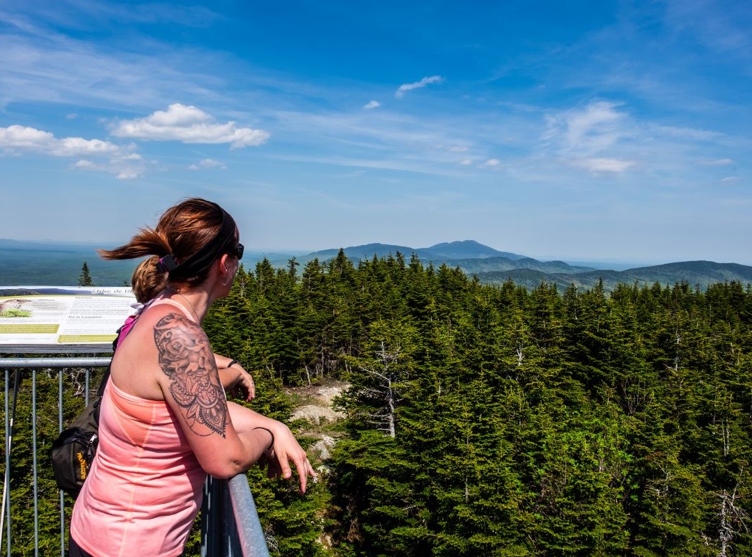 Je ne me suis donc pas fait prier pour marcher jusqu’au sommet du mont Bélanger, qui atteint 960 m d’altitude. Le sentier qui nous y mène, à partir du stationnement en montagne, ne fait que 2,3 km. En moins d’une heure, sur une piste qui parcourt une forêt tapissée de mousse, on arrive à une grande tour d’observation d’où l’on profite d’une vue à 360 degrés sur les spectaculaires montagnes vierges du Maine et des érablières québécoises. Magique.