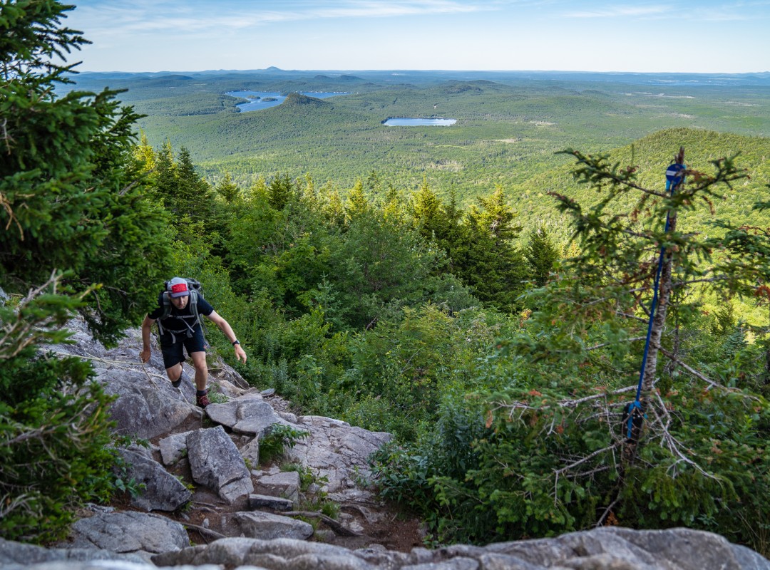 When they arrive at the Parc régional du Mont-Ham, most hikers want to reach the top as quickly as possible. The solution? To take the Intrépide trail, a very steep route, which requires the use of ropes in certain areas and which takes you to the highest point of this Appalachian mountain without any detours, covering less than 2 km.