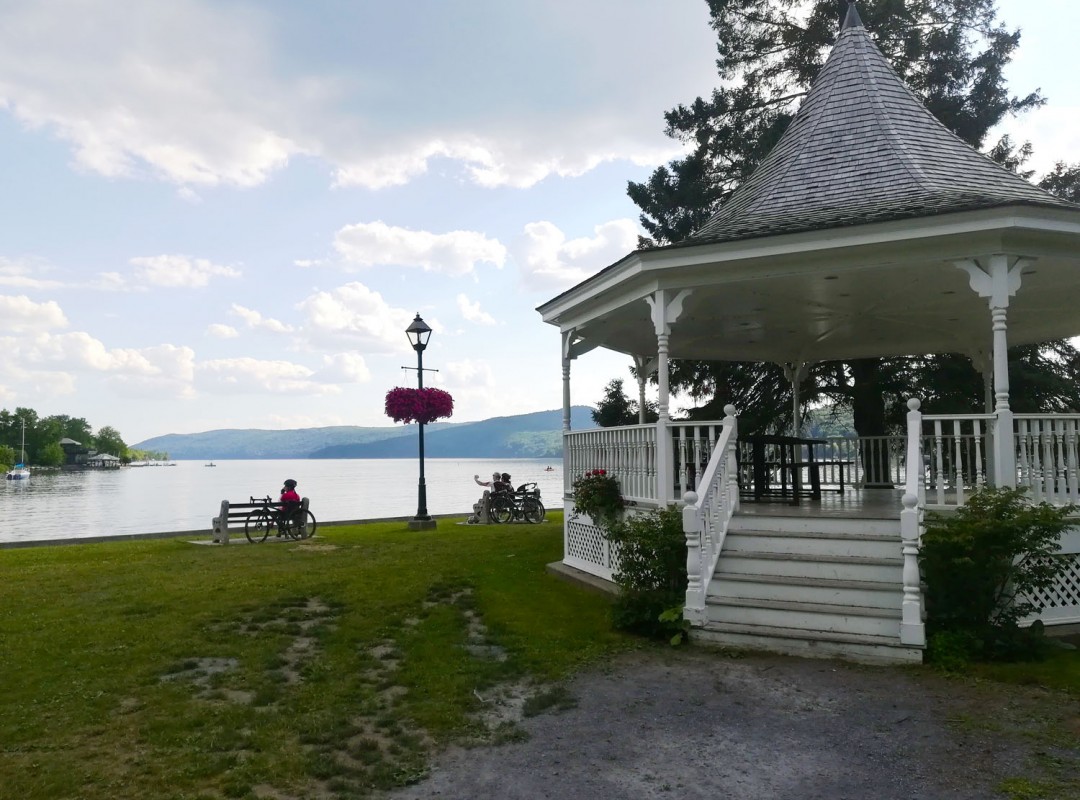 After several bucolic meandering segments inside a forest, through farm fields and along the river, then, cycling across a residential sector, we enter the city of Sherbooke, by way of a wide foot bridge, the Promenade of the Lac des nations, the terraces and the public market of the Vieille Gare. We take our time and have a snack before we get back on our bikes and cycle across the city on steep streets lined with heritage homes.