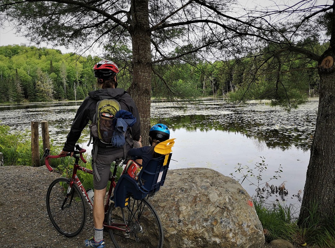19 km pour l’aller en mode familial, c’est un peu trop… surtout quand on calcule qu’il faut revenir! En observant la carte du parcours, on décide de commencer au kilomètre 6 et de voir jusqu’où la motivation des troupes nous mènera. Résultat? Nous nous rendrons au kilomètre 12 avec beaucoup de plaisir. Fiston en est à peine à sa deuxième année de vélo sans les « p’tites roues » et le douze kilomètres total l’aura fatigué, mais pas trop. Le sentier est parfait pour une balade en famille, car il a été mis en place sur une ancienne voie ferrée… il est donc parfaitement plat! Au retour, nous avions peur d’avoir eu affaire à un faux plat que nous aurions dû « remonter », mais non, ça coule tout doucement, comme la rivière à nos côtés.