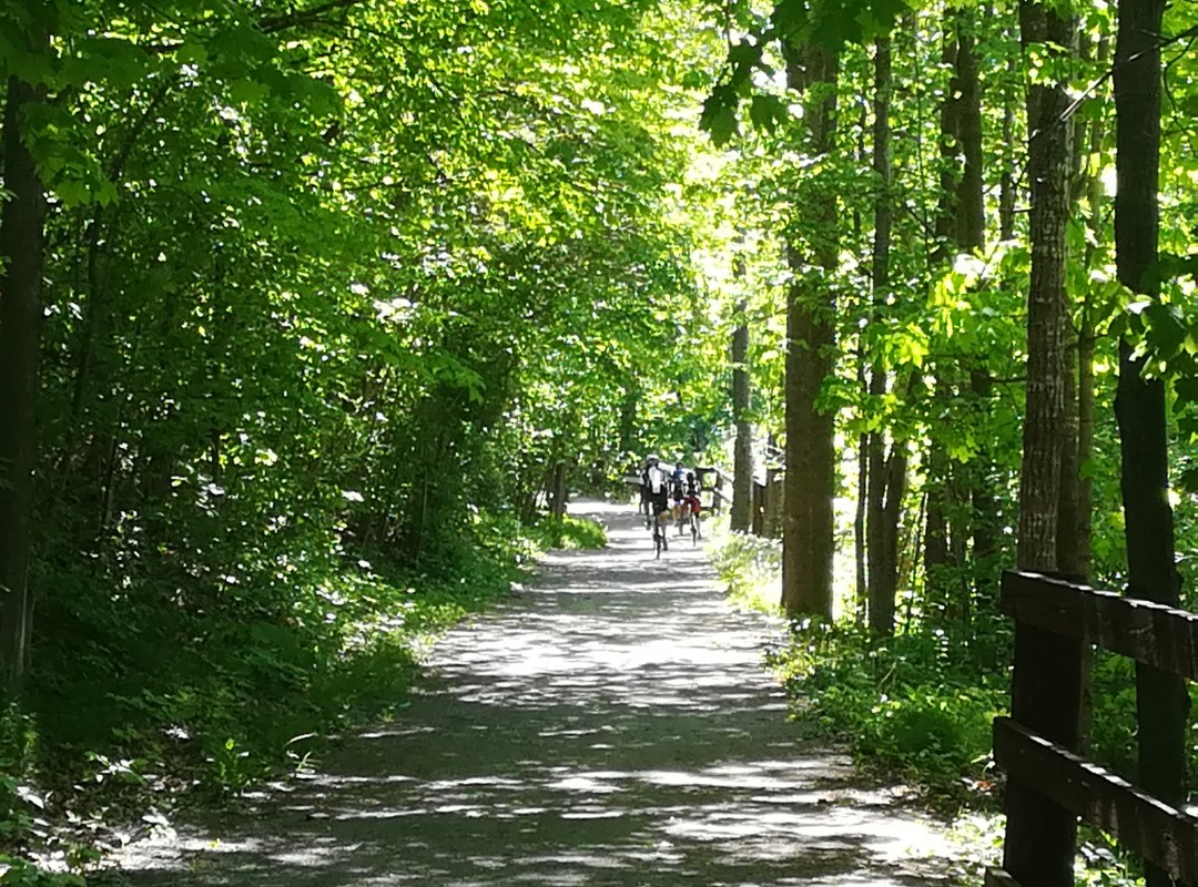We began our ride at the Richmond train station. The enchantment begins as soon as we start pedalling along the old railway route, surrounded for quite a while by trees with their branches forming a canopy over our heads. The play of light and shade is always very delightful in a setting like this. Then, farms and agricultural fields add to the charm of the landscape. “We’re going to come back next autumn, it will be magnificent with all the broad-leaved trees and the beautiful hills,” say Sylvie and Bruno who are accompanying me.