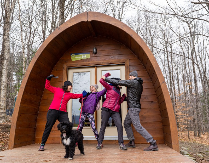 Nous sommes tombés sur la station de montagne Au Diable Vert. Blottie sur les flancs des monts Sutton, cette destination, offrant du camping et de l’hébergement insolite, fait de l’accueil des chiens son produit d’appel. Les pitous bien élevés peuvent même s’y balader sans laisse.