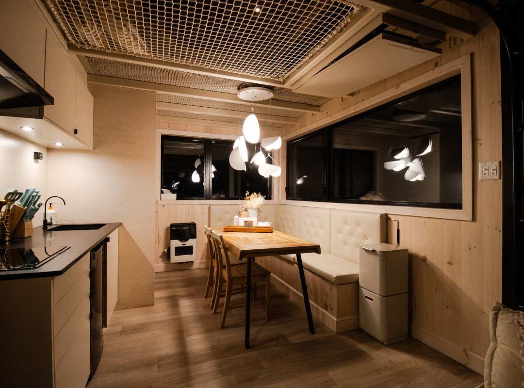 Dans le fond, une agréable cuisine équipée avec un coin repas et de nombreux rangements nous fait nous sentir comme à la maison. Sur la table, une carte avec un mot doux est glissée sous un bouquet de fleur séchées, avec un kit d’accueil aux couleurs de nos hôtes. Puis, juste au-dessus de nos têtes, se trouve le coin nuit.