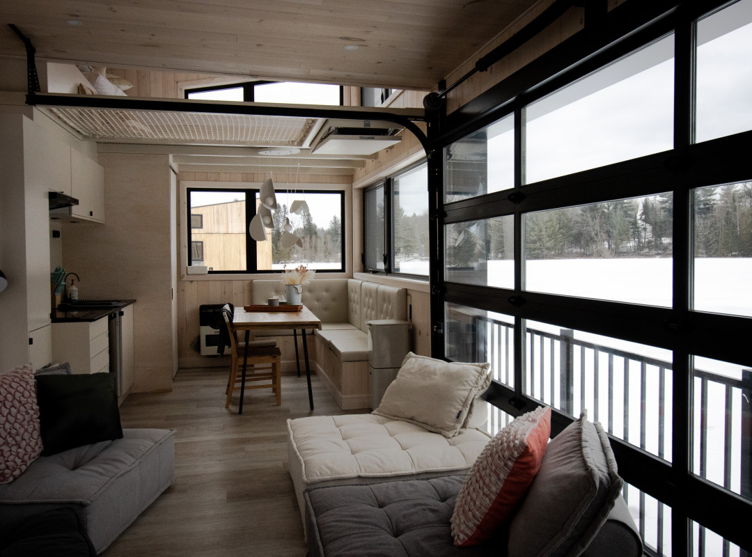Dès lors que l’on pose un premier pied sur la passerelle d’amarrage, l’excitation à l’idée de quitter la terre ferme nous envahis. Nous sommes au-dessus de l’eau! La terrasse qui encercle la quasi-totalité du chalet nous amène devant la porte d’entrée. Plus capables de patienter plus longtemps, nous abaissons la poignée et entrons dans un univers fait de bois et de lumière.