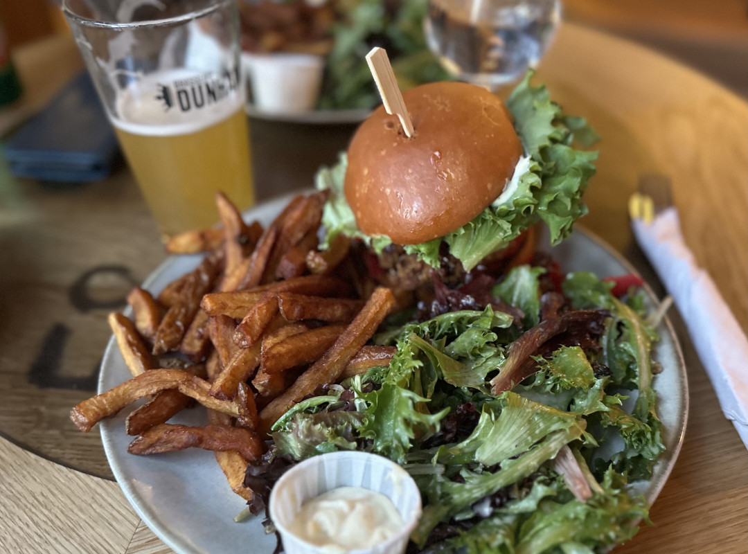 Nous avons ensuite profité d’une promenade tranquille au bord de l’eau au Centre de la nature de Cowansville, histoire de nous dégourdir les jambes et de prendre une bouffée d’air frais. Notre dernière étape de la journée a été le Cœur villageois de Dunham. Pour le souper, nous nous sommes rendus à la Brasserie Dunham. J’ai bien aimé l’ambiance, autant à l’intérieur, animée par les conversations et la décoration, qu’à l’extérieur, baignée par de jolies lumières. Un bon hamburger-frites-salade, accompagné d’une bière rafraîchissante, a parfaitement conclu notre première journée sur la route!
