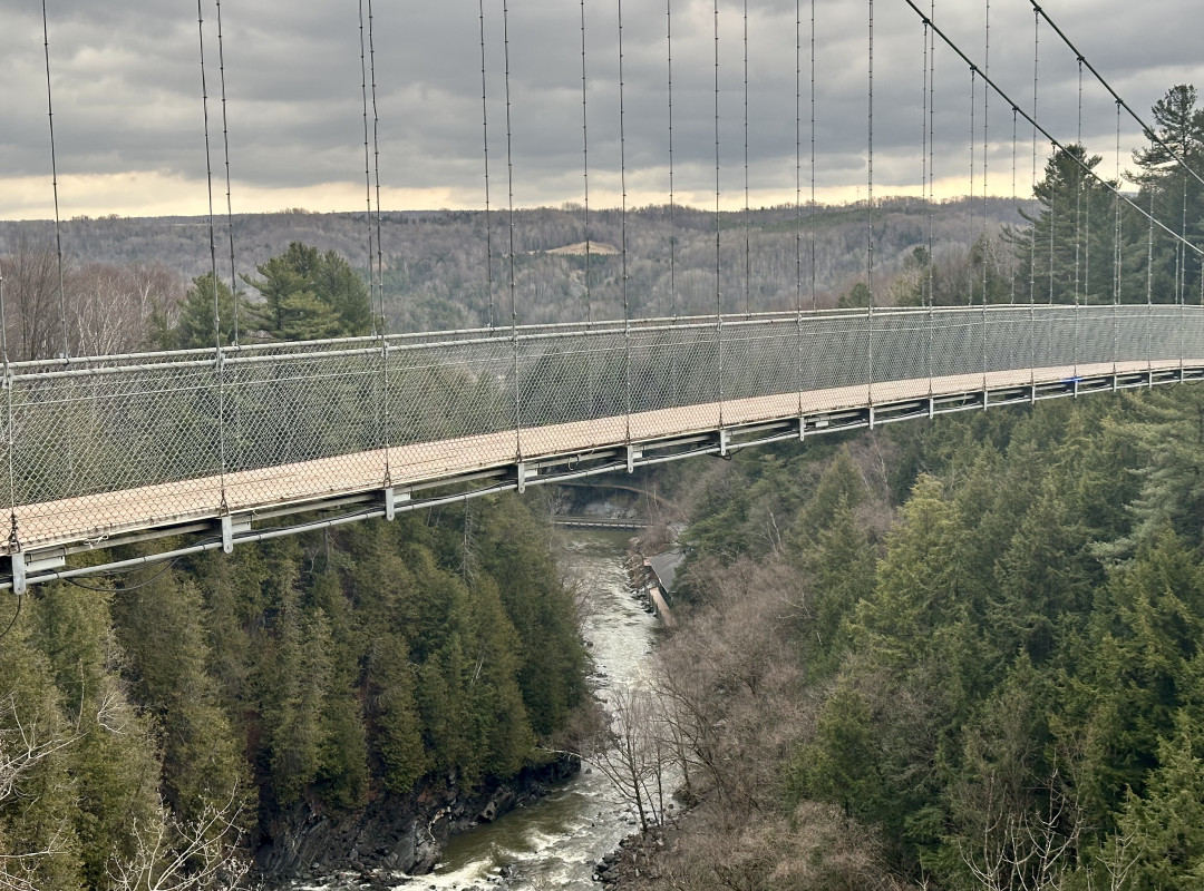 Pour cette quatrième journée, je voulais m’attaquer à une randonnée un peu plus technique. Direction les Sentiers du Morne, près de Lac-Drolet. En chemin, arrêt imprévu à la halte routière de Sawyerville, où nous avons découvert un barrage débordant d’eau — j’adore le son de l’eau en mouvement, c’est apaisant.