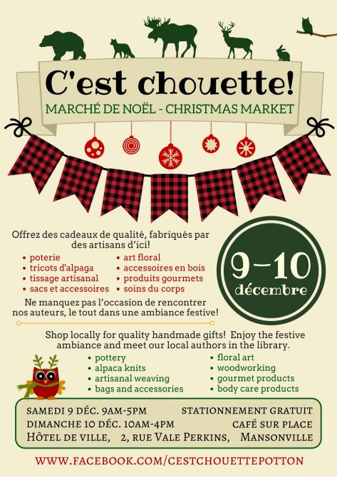 Découvrez l’esprit créatif des artisans d’ici et profitez-en pour offrir des cadeaux de Noël originaux : savons artisanaux, herboristerie, bijoux, poterie, tricots, tissage artisanal, sacs et accessoires, fourrure recyclée, courtepointes, sculptures autochtones, produits gourmets et beaucoup plus!