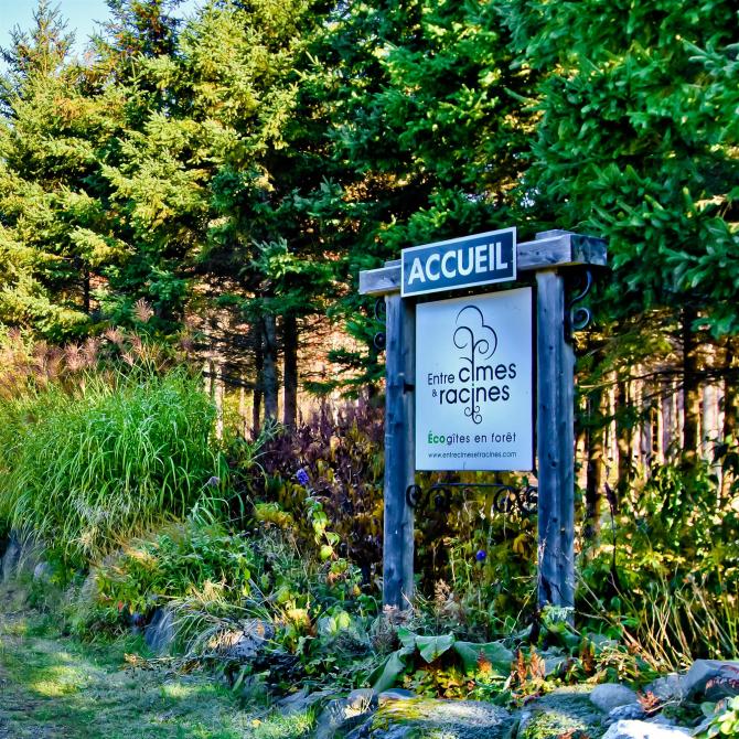 Entre Cîmes et Racines est une entreprise familiale qui offre, depuis 20 ans, de l’hébergement en forêt à proximité de Magog et à une heure de Montréal. Nos écogîtes et nos terrains de camping rustique favorisent la détente, l’évasion et un contact privilégié avec la nature. L’offre est une invitation à décrocher et à se ressourcer en toute saison sur un domaine forestier de 175 acres (71 hectares). Sur place, on trouve 12 kilomètres de sentiers pédestres, un labyrinthe et deux chasses au trésor.