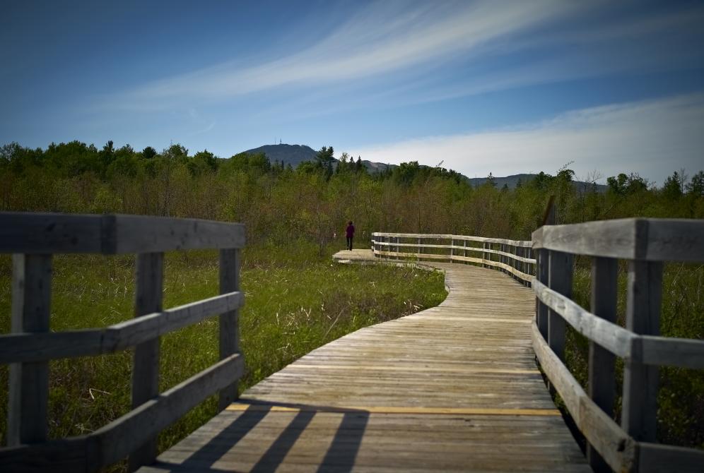 Il s’agit du premier sentier à avoir été aménagé. Suivant le tracé d’une ancienne voie ferrée dont on voit encore les vestiges près du pont, ce sentier est majoritairement composé de passerelles sur pilotis et traverse plusieurs habitats : rivière, marais, tourbière et marécage. Possibilité d'ajouter de petites boucles au bout de ce sentier.