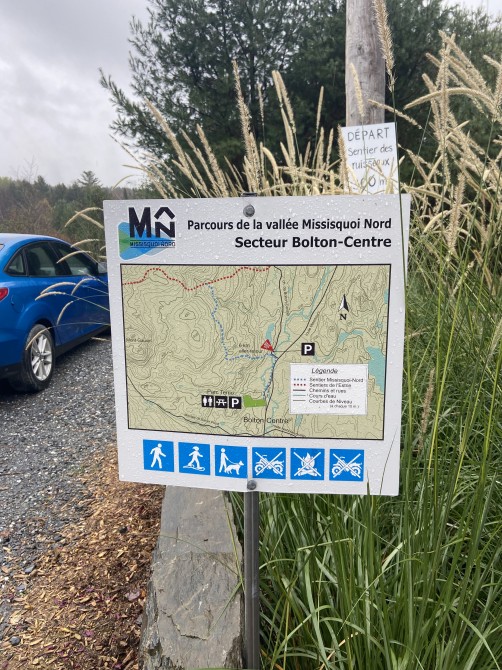 Ce sentier débute au cœur du village de Bolton Centre, au Parc municipal. Sur son 1er km, il longe la rivière par la rue Terrio, la route 245 et le chemin Bolton-Centre en traversant des ponts qui donnent une vue typique de la plaine inondable sur la Missisquoi Nord. Après un virage à gauche sur la route 245 et sur le chemin de Bolton-Centre, on traverse le second pont et on entre en forêt pour 2,5 km. Le sentier grimpe de façon continue et mène à son attrait culminant: une belle chute, l’une des sources de la Missisquoi Nord. Ce sentier peut être fait en aller-retour (total 7km). On peut aussi réaliser une boucle de 8 km en rejoignant quelques centaines de mètre plus loin le réseau Les sentiers de l’Estrie ($).
