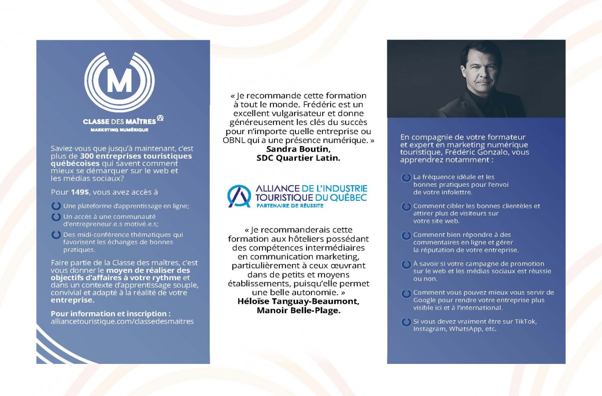 Faire partie de la classe des maîtres, c'est vous donner les moyens de réaliser des objectifs d'affaires à votre rythme. Entreprises touristiques de la région, nous vous invitons à suivre une super belle formation cet hiver pour vous aider à préparer la prochaine saison estivale, à peaufiner vos techniques promotionnelles et à mieux « naviguer » dans ce mouvement de transformation numérique.